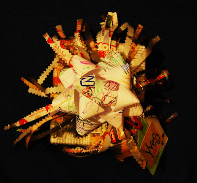 Entonces, envolví cada regalo con papel de diario, de publicidades, y en algunos casos hice unos collages (por ejemplo para mi suegro, con culos y avisos de trolas). Después los decoré con moños que hice con papel de revistitas chotas, con el material de los paquetes de las naranjas (esa especie de red plastica), con paquetes de fideos, retazos de telas, botones solitarios, con lo que venga, loco, todo vale.